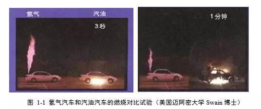 通常情況下,氫的密度僅為空氣的7%(一個標(biāo)準(zhǔn)大氣壓下,0℃下,密度為0.0899g/L),與汽油、丙烷和天然氣相比,具有更大的浮力(快速上升)、擴散性(橫向移動)和快速揮發(fā)性??諝庵泻茈y聚集高濃度的氫,如果發(fā)生泄漏,氫氣會迅速擴散,特別是在開放環(huán)境中,很容易快速逃逸,而不像汽油揮發(fā)后滯留在空氣中不易疏散。美國邁阿密大學(xué)的Swain博士做過一個著名的試驗,如圖1-1所示。兩輛汽車分別用氫氣和汽油作燃料,然后進行泄漏點火試驗。點火3秒后,高壓氫氣產(chǎn)生的火焰直噴上方,汽油則從汽車的下部著火;到1分鐘時,用氫氣作燃料的汽車只有漏出的氫氣在燃燒,汽車沒有大問題,而汽油車則早已成為大火球,完全燒光。所以氫氣易揮發(fā)的性質(zhì),與普通汽油車相比,有利于汽車的安全。