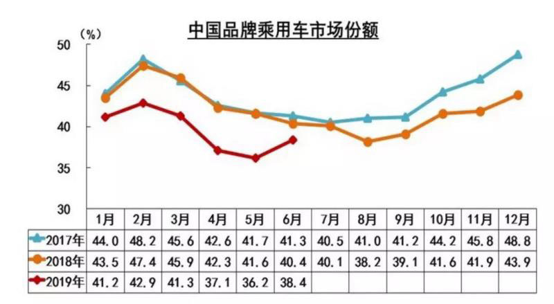 6月自主品牌乘用車共銷售66.4萬輛,同比下降12.2%,占乘用車銷售總量的38.4%,比上年同期下降1.9個(gè)百分點(diǎn)。1-6月,中國品牌乘用車共銷售399.8萬輛,同比下降21.7%,占乘用車銷售總量的39.5%,比上年同期下降3.9個(gè)百分點(diǎn)。