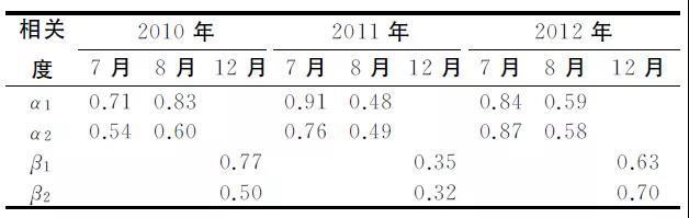 通過梳理廣東?。常磦€氣象站2010~2012年的氣溫數(shù)據(jù),分析氣溫和日負荷率、日最小負荷率的相關性。在排除節(jié)假日、周末等因素的影響后,發(fā)現(xiàn)7、8、12月的日負荷率及日最小負荷率與氣溫的相關程度一般高于其他月份(表3)。其中,7、8月的日負荷率與日平均氣溫的相關度α1較高,而最小日負荷率與日平均最低氣溫的相關度α2較高;12月的日負荷率及日最小負荷率與日平均最高氣溫有一定的相關性,相關度為β1、β2。由表3可知,7、8、12月的日負荷率及日最小負荷率與氣溫的相關度基本都高于0.5,為顯著相關。其中2011年8月受錯峰影響,相關度有所下降;12月受寒潮影響,月內氣溫起伏較大,導致相關度較低。一般來說,8月的氣溫越高,負荷水平越高,特別是晚間的負荷水平增加明顯,使得日負荷率和日最小負荷率較高;12月溫度較低,會使高峰時段降溫負荷有所增加,日最大負荷相對升高,導致日負荷率和日最小負荷率降低。
