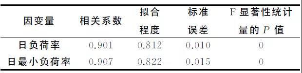 對廣東省第二、第三產業(yè)及居民用電量與日負荷率、日最小負荷率進行回歸分析,結果見表2。由表2可知,回歸效果非常顯著。用電結構對日負荷率、日最小負荷率的擬合程度均在0.8以上,相關系數(shù)均在0.9以上,說明產業(yè)及居民用電結構基本決定了日負荷率和日最小負荷率的變化趨勢,其他因素的綜合作用影響不大。