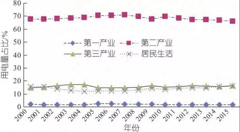 2000年以來,廣東省產業(yè)結構不斷調整,但變化幅度不大,基本保持第一產業(yè)下降、第二、三產業(yè)均衡發(fā)展的格局。廣東省各產業(yè)及居民生活用電結構見圖4。由圖4可知,廣東省第一產業(yè)用電量占比很小,僅占全社會用電量的2%左右;第二產業(yè)用電量占全社會用電量的65%以上,近年來呈下降趨勢;第三產業(yè)和居民生活用電量所占比重有所增加。分別對第二、三產業(yè)和居民用電量的比重和負荷的季不均衡系數(shù)、月不均衡系數(shù)平均值、年平均日負荷率、年平均日最小負荷率進行回歸分析,影響程度計算結果與分析如下。