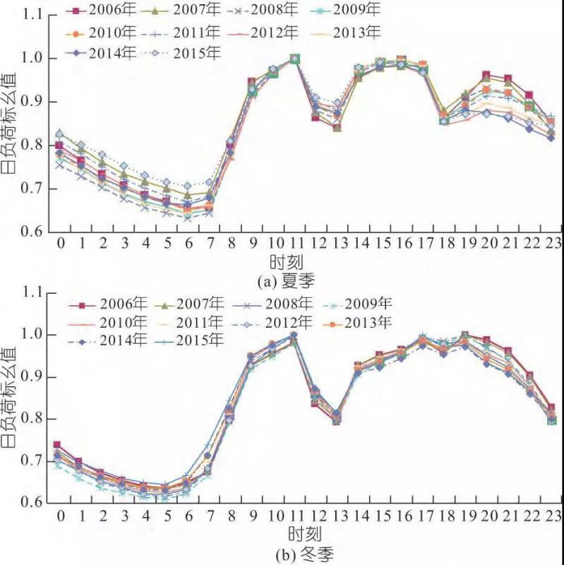 2006~2015年廣東電網夏季與冬季典型日負荷曲線見圖3。由圖3可知,廣東電網夏季和冬季典型日負荷曲線在各年份呈現(xiàn)的形狀一致性很高;夏、冬兩季日負荷曲線形狀基本一致,每天存在三峰三谷,兩者僅晚上負荷曲線略有不同。夏季典型日最高峰通常出現(xiàn)在11:00左右,低谷負荷出現(xiàn)在早上6:00 左右,日最小負荷率在0.63~0.71之間。冬季典型日負荷早高峰統(tǒng)一出現(xiàn)在11:00左右,若溫度較低,由于晚間保溫負荷的增加,晚高峰為全天高峰;低谷負荷出現(xiàn)在凌晨5:00左右,同時也是日最小負荷,日最小負荷率在0.61~0.65之間,低于夏季典型工作日最小負荷率。