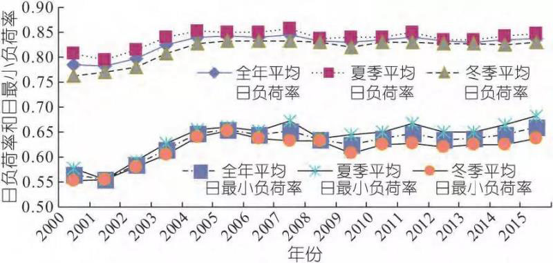 2.2 年平均日負荷率、日最小負荷率日負荷率是日平均負荷與日最大負荷的比值,反映負荷一天內的平穩(wěn)程度;日最小負荷率是日最小負荷與日最大負荷的比值,反映負荷一天內的變化幅度。2000~2015年廣東電網年平均日負荷率、年平均日最小負荷率見圖2。由圖2可知,近5年來廣東電網全年平均日負荷率維持在0.83~0.84,平均日最小負荷率在0.64~0.66之間。夏季與冬季平均日負荷率變化趨勢相同,僅變化程度略有差異。夏季因受制冷負荷的影響,日負荷率與日最小負荷率均稍高于冬季。