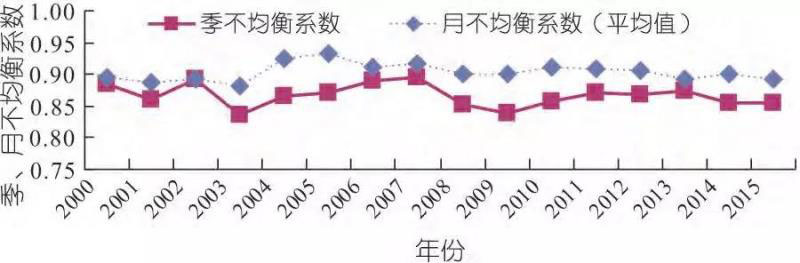 廣東電網季不均衡系數(shù)和月不均衡系數(shù)平均值的變化曲線見圖1。由圖1可知,近5年來,季不均衡系數(shù)的變化基本在0.85~0.87之間,月不均衡系數(shù)基本在0.89~0.91之間,波動不大。
