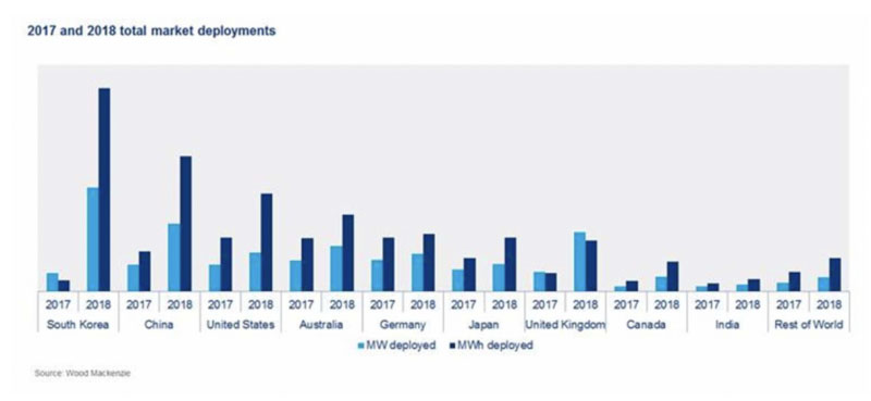 Wood Mackenzie公司指出,中國政府在儲能領域的積極政策激勵是促進該行業(yè)快速增長的主要原因,也是儲能部署的主要推動力。中國2018年部署的儲能容量為580MW/1.14GWh,儲能市場規(guī)模累計達到1.07GW/1.98GWh,并且已經(jīng)確立其在亞太地區(qū)第二大儲能市場的地位。而在儲能部署方面,韓國在亞太地區(qū)仍名列首位。Wood Mackenzie公司對于中國2018年儲能市場增長進行的評論說,“中國電網(wǎng)側(FTM)儲能部署大幅增長,與2017年相比,2018年的裝機容量增長了五倍。”