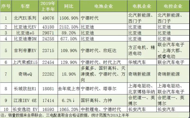 高工產業(yè)研究院(GGII)統(tǒng)計數據,2019年上半年國內新能源乘用車銷售57.7萬輛,同比增長65.9%,其中銷量前10車型銷量占比近5成,幾乎占了一半的市場份額。