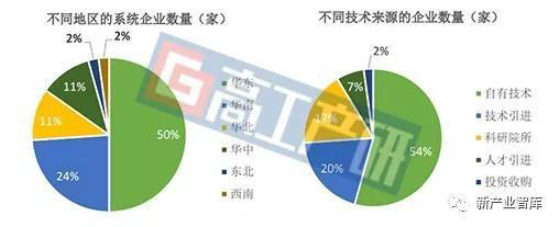 中國46家系統(tǒng)企業(yè)中,50%(23家)的燃料電池系統(tǒng)企業(yè)位于華東地區(qū),華南地區(qū)系統(tǒng)企業(yè)有11家,占比24%,這些企業(yè)的成立時間為2015~2019年。分析46家企業(yè)的技術(shù)來源,自有技術(shù)的企業(yè)占比54%,共25家;靠技術(shù)引進的企業(yè)有9家;技術(shù)來自科研院所的企業(yè)有8家。