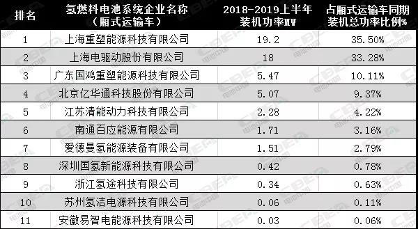 據(jù)動力電池應用分會研究部統(tǒng)計,2018年-2019年上半年已投產(chǎn)的箱式運輸車的裝機功率為54.09MW,參與氫燃料電池系統(tǒng)供應的廠商共計11家。贏得市場份額最多的前三甲分別是上海重塑、上海電驅動和廣東國鴻重塑。