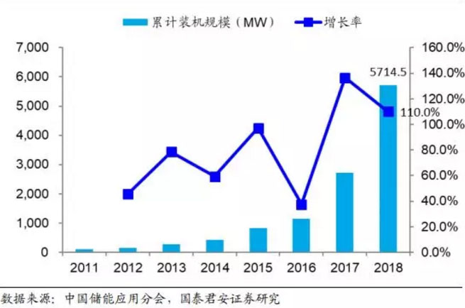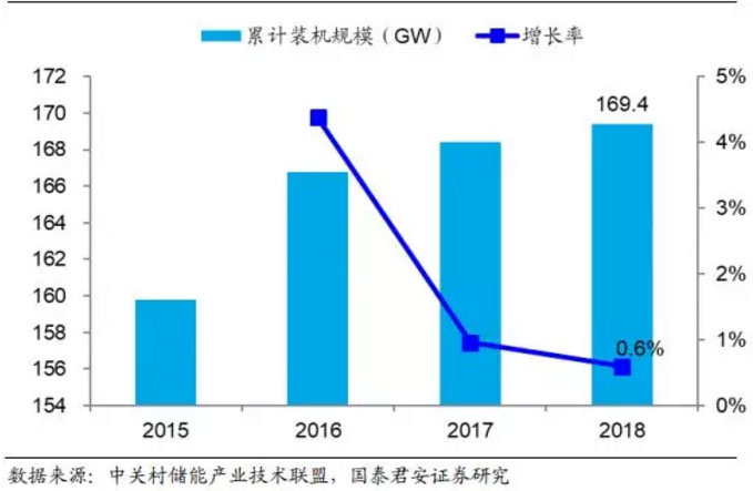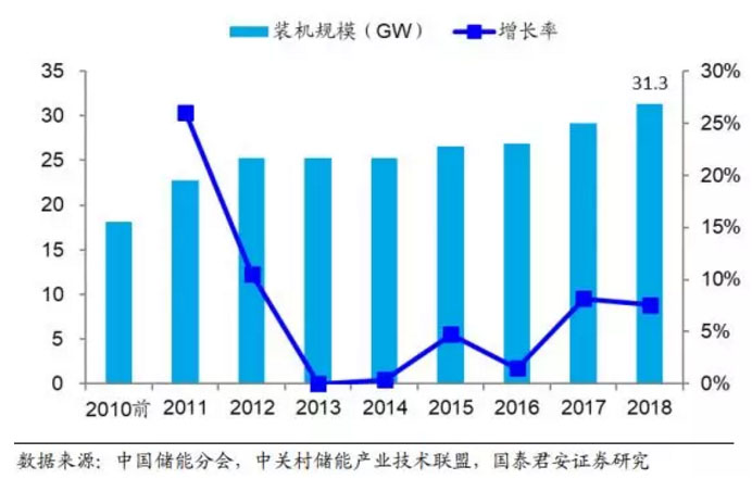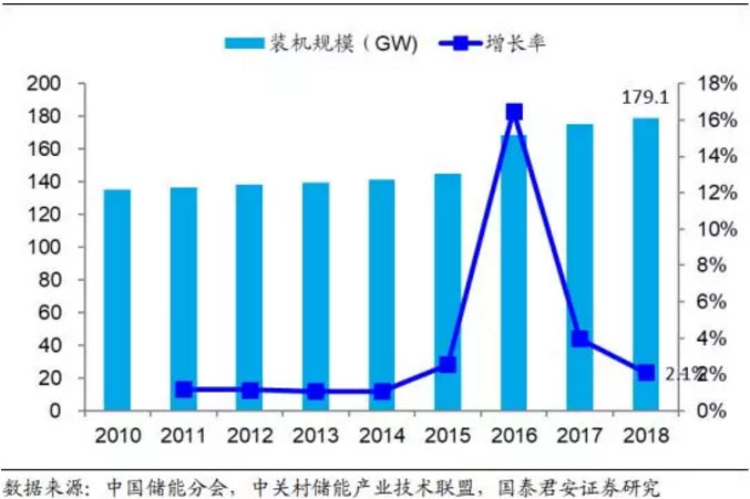 儲能產(chǎn)業(yè)興起較早且發(fā)展穩(wěn)定,截止 2010 年底儲能累計裝機規(guī)模已經(jīng)達到 135GW;2010-2015 年期間的由于受到整體經(jīng)濟低迷影響,整體裝機量增速放緩, 截止 2015 年累計裝機規(guī)模達到 144.8GW;2016-2018 年由于受到成本下降和政策推動的雙重刺激,儲能行業(yè)快速發(fā)展,截止 2018 年底累計裝機規(guī)模達到 179.1GW。