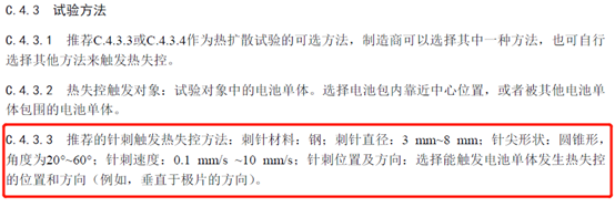 雖然新國(guó)標(biāo)中取消了電池單體的針刺試驗(yàn),但有意思的是,在新國(guó)標(biāo)附錄C關(guān)于熱擴(kuò)散乘員保護(hù)分析與驗(yàn)證報(bào)告中,推薦作為熱擴(kuò)散試驗(yàn)的可選方法里出現(xiàn)了針刺觸發(fā),同時(shí)《準(zhǔn)入管理規(guī)定》里“暫不執(zhí)行”的描述也較為曖昧,這對(duì)未來(lái)是否會(huì)恢復(fù)針刺試驗(yàn)留下了一個(gè)猜想的空間。