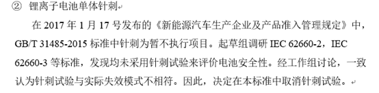 而在去年1月25日發(fā)布的征求意見(jiàn)稿編制說(shuō)明中,再次解釋了取消針刺實(shí)驗(yàn)的原因。除了《準(zhǔn)入管理規(guī)定》里明確針刺實(shí)驗(yàn)暫不執(zhí)行以外,起草組對(duì)于IEC等標(biāo)準(zhǔn)調(diào)研發(fā)現(xiàn)沒(méi)有采用針刺和認(rèn)為針刺試驗(yàn)與實(shí)際失效模式不相符是決定新國(guó)標(biāo)中取消針刺試驗(yàn)的另外兩個(gè)原因。