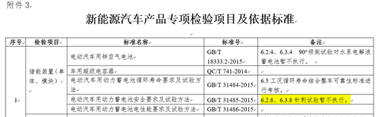 不過(guò)從相關(guān)文件查閱可以看到,早在2017年7月1日開(kāi)始施行的《新能源汽車生產(chǎn)企業(yè)及產(chǎn)品準(zhǔn)入管理規(guī)定》(以下簡(jiǎn)稱“準(zhǔn)入管理規(guī)定”)的附件3中就提到針刺實(shí)驗(yàn)暫不執(zhí)行。