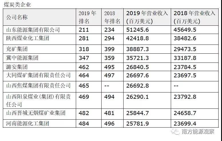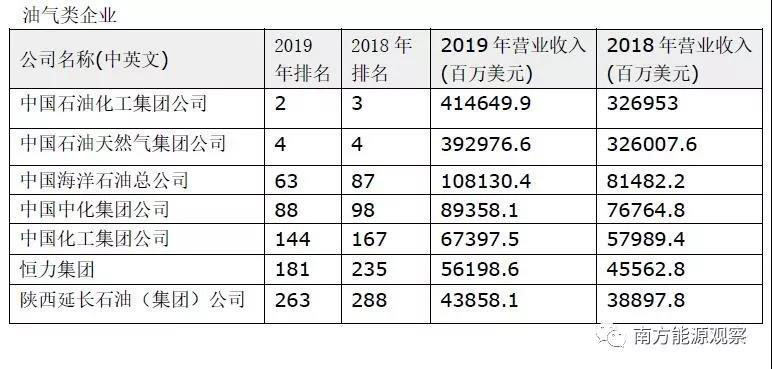 油氣類企業(yè)方面,中國石油天然氣集團(tuán)公司穩(wěn)居第四位;中國石油化工集團(tuán)公司、中國海洋石油總公司、中國中化集團(tuán)公司、中國化工集團(tuán)公司、恒力集團(tuán)、陜西延長石油(集團(tuán))公司等6家公司有所上升,分別上升了1名、24名、10名、23名、54名、25名、42名。雖然排名和營收較2018年有所提升,但中國化工集團(tuán)公司實際虧損22.076億美元,為本次上榜的中國能源企業(yè)中虧損最大的企業(yè)。
