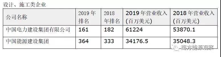 涉及能源設(shè)施設(shè)計、施工的企業(yè)中,中國電力建設(shè)集團(tuán)有限公司進(jìn)步了21名,排名第161;中國能源建設(shè)集團(tuán)排名較2018年后退了31名,排名第364,其2019年營業(yè)收入也較2018年少8.718億美元。