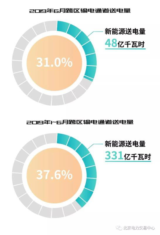 2019年6月,通過(guò)天中、祁韶、靈紹、魯固等跨區(qū)通道組織西北、東北地區(qū)新能源送華北、華東、華中電量48億千瓦時(shí),輸電通道新能源占比31.0%,同比增長(zhǎng)3.2個(gè)百分點(diǎn)。截至6月底,通過(guò)天中、祁韶、靈紹、魯固、德寶等跨區(qū)通道組織西北、東北地區(qū)新能源送華北、華東、華中、西南累計(jì)電量331億千瓦時(shí),輸電通道新能源占比為37.6%,同比增長(zhǎng)1個(gè)百分點(diǎn)。
