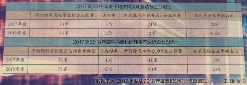 記者經(jīng)過梳理和計算發(fā)現(xiàn),2018年度企業(yè)的平均燃料消耗量達標率呈下降趨勢,與2017年度相比下降幅度高達10%。這一變化也印證了在2018年度,“輕傳統(tǒng)燃油車降低油耗,重新能源汽車積分”的現(xiàn)象有所加劇,企業(yè)實現(xiàn)平均油耗達標,對新能源汽車積分的依賴度越來越高。