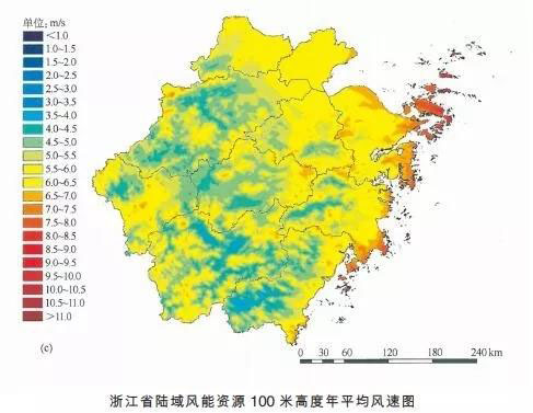 浙江省風(fēng)能資源的空間分布總體呈現(xiàn)近海風(fēng)能區(qū)(等深線50米以內(nèi)的海域和近海島嶼)、沿海風(fēng)能帶(杭州灣南岸、甬臺溫沿海岸區(qū))和內(nèi)陸風(fēng)能點(千米以上的高山山頂山脊)的特征,風(fēng)速和風(fēng)功率密度由近?!0丁獌?nèi)陸逐漸遞減。全省有開發(fā)價值的風(fēng)電基本分布在近海海域、海島、沿海灘涂和高山上(見圖)。