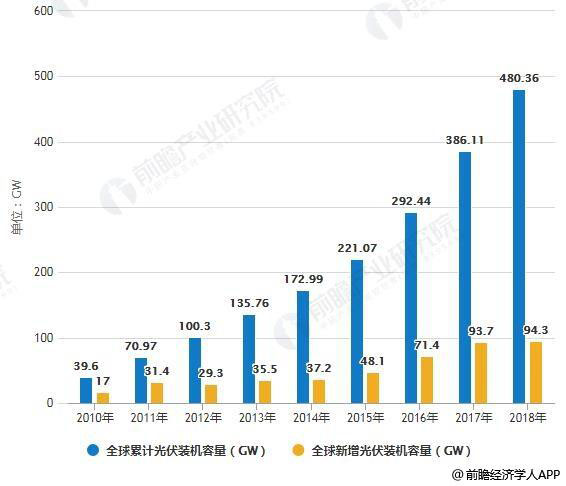 2010-2018年全球新增及累計光伏裝機(jī)容量統(tǒng)計情況