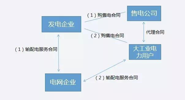 新電改模式下,發(fā)電企業(yè)與售電公司或大工業(yè)電力用戶之間的購(gòu)售電合同、發(fā)電企業(yè)或電力用戶與電網(wǎng)企業(yè)之間的輸配電服務(wù)合同、售電公司與電力用戶之間的代理合同等多個(gè)合同關(guān)系組合構(gòu)成一個(gè)完整的電力交易關(guān)系。