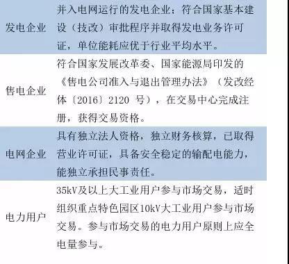 新電改后參加電力交易的市場(chǎng)主體主要包括四類:發(fā)電企業(yè)、售電公司、電網(wǎng)企業(yè)以及電力用戶。由于各個(gè)省分對(duì)于市場(chǎng)主體的具體要求不完全一致,故下面筆者將以《2018年廣西電力市場(chǎng)交易實(shí)施方案和實(shí)施細(xì)則》(2019年實(shí)施方案和細(xì)則尚未頒布)中對(duì)各市場(chǎng)主體的規(guī)定為例作簡(jiǎn)要介紹。