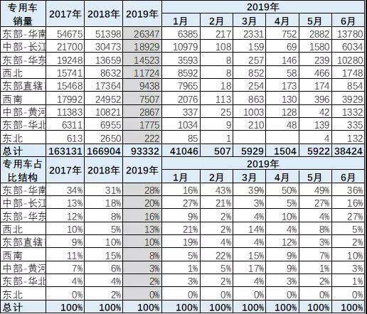 專用車的年初一般較低,但2019年1月的銷量特別高啊,隨后的2月和3月的表現(xiàn)也很強(qiáng),4-6月的走勢(shì)逐步回落。