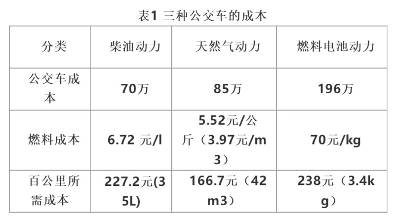 大金龍XMQ6125G的油耗未找到官方數(shù)據(jù),根據(jù)百度知道數(shù)據(jù),11-12米公交車的油耗約為30-35升,因此選為35L。而由卡車之家數(shù)據(jù),通常氣耗與油耗比為1.1-1.2之間,即每消耗1L柴油相當(dāng)于消耗1.1-1.2方的天然氣。因此,天然氣客車采用42立方米進(jìn)行計算。而根據(jù)成都市燃料電池客車示范運(yùn)行的數(shù)據(jù),燃料電池客車平均氫耗為3.4kg/百公里(數(shù)據(jù)來源:http://m.evpartner.com/news/detail-41996.html)。