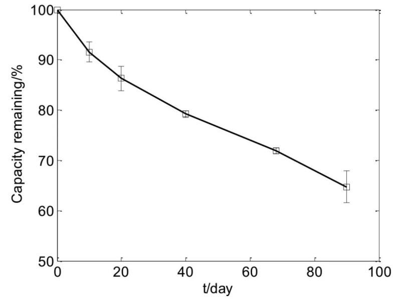 圖2. 55 ℃存儲(chǔ)電池容量保持率同存儲(chǔ)時(shí)間關(guān)系曲線。