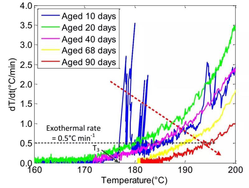 如圖4所示,與圖3結(jié)果類似,隨著存儲(chǔ)時(shí)間的延長(zhǎng)同等溫度下老化電池的自產(chǎn)熱速率不斷降低,表明老化后電池的熱穩(wěn)定性確實(shí)提高。作者推測(cè)原因可能是:(1)老化過程消耗了電池活性材料,導(dǎo)致熱失控階段活性材料量減少;(2)老化形成的非活性層覆蓋住了部分活性位點(diǎn),使得熱失控過程副反應(yīng)程度降低。