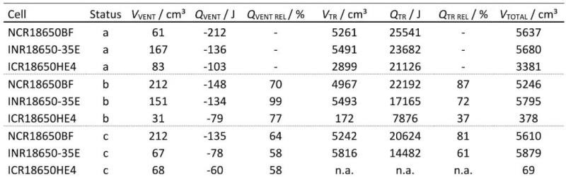 表2. 三種不同電池新鮮狀態(tài)(Status a)、循環(huán)老化后(Status b)和60 ℃存儲(chǔ)老化后(Status c)加熱測(cè)試特征對(duì)比。其中TVENT為首次開閥溫度,TONSET為電池自產(chǎn)熱溫度,TTR為開始熱失控瞬間溫度,TMAX為熱失控過程最高溫度。