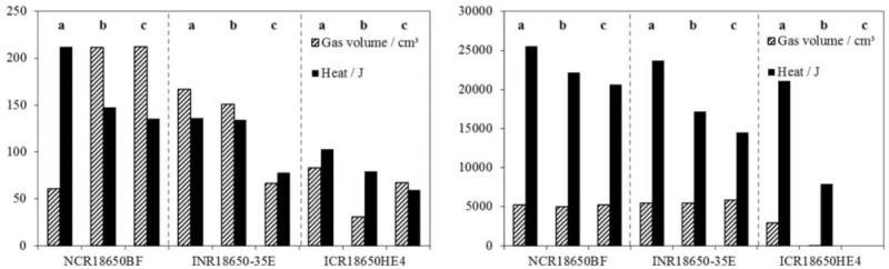 表2和表3對(duì)比三種不同電池在新鮮狀態(tài)(Status a)、循環(huán)老化后(Status b)和60 ℃存儲(chǔ)老化后(Status c)加熱測(cè)試的特征。其中,ICR18650HE4電池高溫存儲(chǔ)老化后加熱未發(fā)生熱失控。從表3可以看出,相比新鮮電池,循環(huán)老化和高溫存儲(chǔ)老化后的電池在開閥和熱失控過程的熱交換均有所降低。ICR18650HE4電池老化后無論是產(chǎn)氣量還是放熱量較新鮮電池均有顯著降低,且無論哪種狀態(tài)ICR18650HE4電池的產(chǎn)氣量和放熱量均是最低的。新鮮狀態(tài)下,NCR18650BF的開閥產(chǎn)氣量低于INR18650-35E,而按兩種方式老化后則是NCR18650BF的開閥產(chǎn)氣量高于INR18650-35E。更為重要的是,從總產(chǎn)熱量看,高溫存儲(chǔ)老化后電池的產(chǎn)熱量更低,表明高溫存儲(chǔ)老化后電池的熱穩(wěn)定性更高。