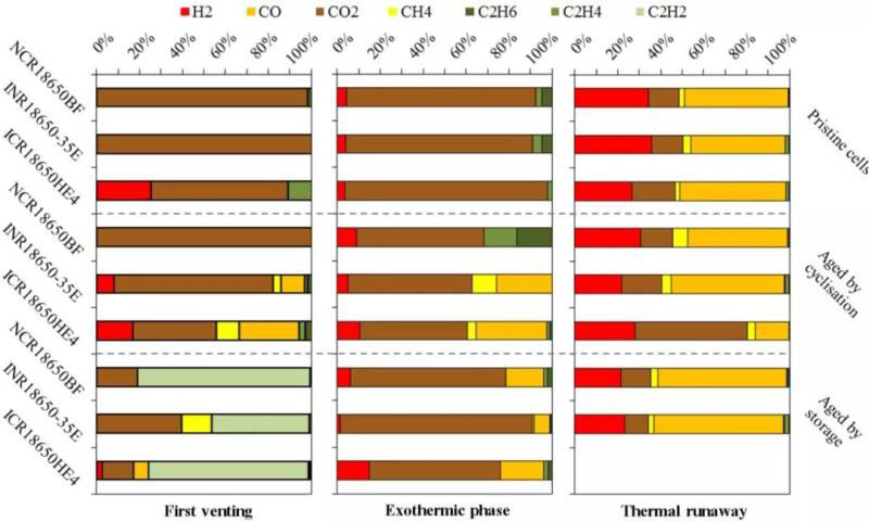 圖4的信息量非常大,需要仔細(xì)琢磨?,F(xiàn)重點(diǎn)分析NCR18650BF和INR18650-35E兩款電池在不同狀態(tài)首次開閥時(shí)的氣體特征。在新鮮狀態(tài),兩款電池首次開閥釋放的氣體均為CO2。循環(huán)老化后首次開閥,NCR18650BF釋放的還是CO2,而INR18650-35E釋放的氣體除了CO2,還有H2、CH4、CO等。高溫存儲(chǔ)老化后NCR18650BF釋放的大部分是C2H2,剩下的為CO2;而INR18650-35E釋放的氣體中CO2和C2H2分別各占40%,CH4占到20%。