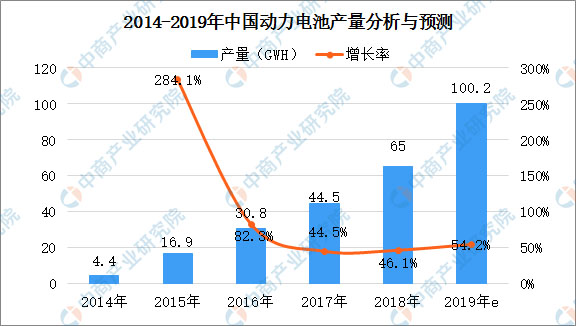 近年來,我國動力鋰離子電池發(fā)展迅猛,主要得益于國家政策對新能源汽車產(chǎn)業(yè)的大力支持。2018年中國新能源汽車產(chǎn)量同比增長50.62%,達(dá)122萬輛,產(chǎn)量為2014年的14.66倍。受新能源汽車市場發(fā)展帶動,2017-2018年中國動力電池市場保持高速增長,調(diào)研統(tǒng)計,2018年中國動力電池市場產(chǎn)量同比增長46.07%,達(dá)65GWh。