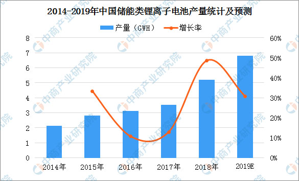 我國儲能類鋰離子電池領(lǐng)域雖然市場空間巨大,但目前受成本、技術(shù)等因素限制,仍處于市場導(dǎo)入期。2018年中國儲能類鋰離子電池產(chǎn)量同比增加48.57%,達(dá)5.2GWh。預(yù)計2019年中國儲能類鋰離子電池產(chǎn)量達(dá)6.8GWh。