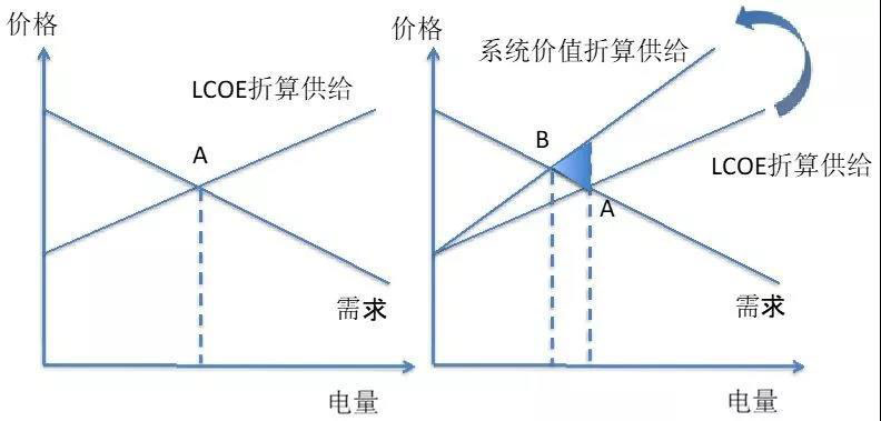 從供需角度來(lái)看,僅將發(fā)電側(cè)LCOE拿來(lái)與其他電源比較,風(fēng)電光伏項(xiàng)目仿佛將在A點(diǎn)已經(jīng)具有競(jìng)爭(zhēng)力,但實(shí)際上,疊加調(diào)峰成本后,風(fēng)電項(xiàng)目真實(shí)度電成本在在B點(diǎn)。AB兩點(diǎn)之間的差額目前沒(méi)有得到良好的測(cè)算和預(yù)期,是投資決策時(shí)點(diǎn)的巨大盲點(diǎn)。