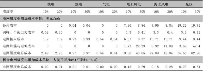 基于當(dāng)時(shí)的技術(shù)水平和裝機(jī)容量,OECD/NEA以2012年的德國(guó)電力系統(tǒng)為例,對(duì)各項(xiàng)技術(shù)在不同滲透率的情況下、電網(wǎng)級(jí)別需要額外考慮的成本進(jìn)行了估計(jì)。從分析可知,核、煤、氣等具有良好調(diào)峰性能和規(guī)模效應(yīng)的電源附加成本較低;而風(fēng)電光伏等電源由于間歇性特征對(duì)調(diào)峰、備用和電網(wǎng)建設(shè)等的需求較大,在10%滲透率下,需每度電額外考慮0.1-0.2元/kwh的成本,如滲透率為30%,電網(wǎng)側(cè)附加成本還要更高。