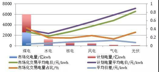 根據(jù)中電聯(lián)統(tǒng)計(jì),2019年一季度,全國(guó)電力市場(chǎng)交易電量(含發(fā)電權(quán)交易電量)合計(jì)為4445億度,同比增長(zhǎng)33.8%,占全社會(huì)用電量比重為26.5%。其中,大型發(fā)電集團(tuán)旗下風(fēng)電資產(chǎn)市場(chǎng)化交易電量比例為24.1%,含補(bǔ)貼市場(chǎng)化交易平均電價(jià)為0.4697元/度,比上網(wǎng)電量平均電價(jià)低0.0814元/度。由此折算,交易電價(jià)比標(biāo)桿電價(jià)實(shí)際平均價(jià)差0.11元/度。在各類(lèi)電源中,風(fēng)電屬于參與比例較高、價(jià)差幅度較大的品種。
