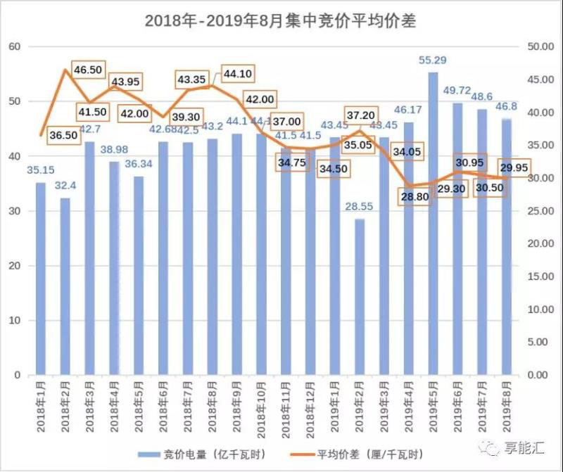 圖2:廣東2018年全年到2019年前8個(gè)月集中競(jìng)價(jià)價(jià)差對(duì)比
