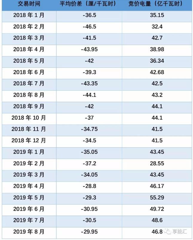 表1:2018年前年到2019年前8個(gè)月廣東集中競(jìng)爭(zhēng)交易價(jià)差和電量(價(jià)差和電量均為四舍五入后數(shù)據(jù))