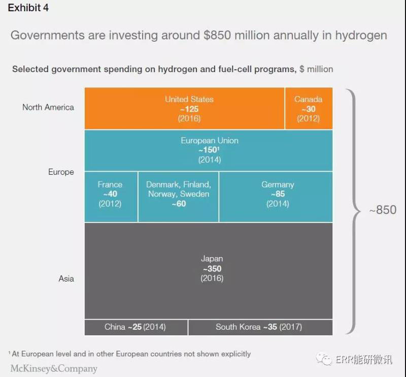 由加利福尼亞,德國(guó),日本和韓國(guó)領(lǐng)導(dǎo)的一組地區(qū)正在推動(dòng)開發(fā),每年花費(fèi)超過8.5億美元用于推進(jìn)氫和燃料電池技術(shù)(圖4)。其他國(guó)家也在積極關(guān)注,包括中國(guó),中國(guó)正在開始擴(kuò)大自己的制造能力以及加油站網(wǎng)絡(luò)。在全球范圍內(nèi),各國(guó)已宣布到2025年將建造約2800個(gè)加氫站。與全球估計(jì)的60萬(wàn)個(gè)加油站相比,這是一個(gè)很小的數(shù)字,但如果實(shí)現(xiàn)這一點(diǎn),就足以覆蓋氫汽車的主要市場(chǎng)(德國(guó)倡議H2Mobility估計(jì),全國(guó)覆蓋400個(gè)加油站)。