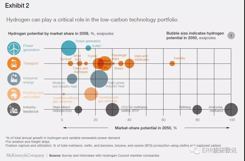 如上所述,氫在能源系統(tǒng)中具有廣泛的應(yīng)用(圖2),其中最重要的是氫運(yùn)輸部門的脫碳作用。在氫能委員會(huì)的愿景中,氫氣被大力部署以將全球變暖限制在2度,全球氫需求增長(zhǎng)的三分之一可能來(lái)自交通運(yùn)輸部門。到2050年,該委員會(huì)成員認(rèn)為,氫動(dòng)力燃料電池汽車可占車輛總數(shù)的20%,約4億輛汽車,1500萬(wàn)至2000萬(wàn)輛卡車和約500萬(wàn)輛公共汽車。在他們的設(shè)想中,氫將在較重和遠(yuǎn)程路段中發(fā)揮更大的作用,因此,由于這些路段的行駛距離較長(zhǎng),燃料效率較低,氫對(duì)道路運(yùn)輸部門的總排放減排目標(biāo)的貢獻(xiàn)大約高出其份額的30%。