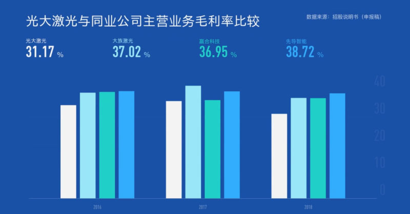 招股書顯示,報(bào)告期(2016~2018年,下同)內(nèi),光大激光主營(yíng)業(yè)務(wù)毛利率分別為34.37%、35.86%和31.17%,呈現(xiàn)先上升后下降的趨勢(shì)。對(duì)于毛利率變化,公司解釋稱,動(dòng)力電池設(shè)備通常需要根據(jù)客戶個(gè)性化需求進(jìn)行定制化生產(chǎn),由于單臺(tái)設(shè)備價(jià)值較高,產(chǎn)品價(jià)格有“一單一議”的特點(diǎn),具體業(yè)務(wù)的毛利率水平受技術(shù)要求、供求關(guān)系、談判結(jié)果等多重因素影響。