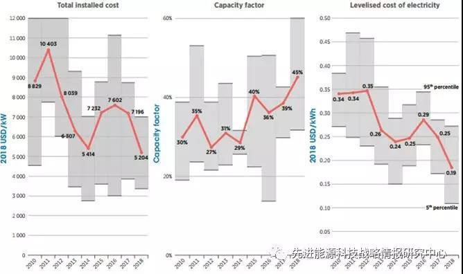 圖3b 2010-2018年間海上風(fēng)電全球加權(quán)平均裝機(jī)成本(單位:美元/千瓦)、容量因子和LCOE(單位:美元/千瓦時(shí))變化態(tài)勢(shì)