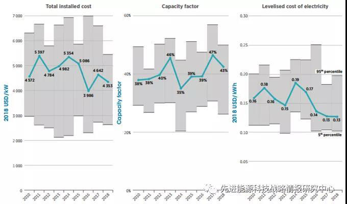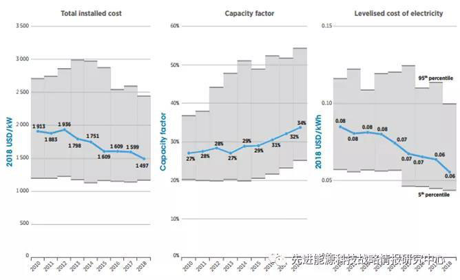 圖2 2010-2018年間CSP全球加權(quán)平均裝機(jī)成本(單位:美元/千瓦)、容量因子和LCOE(單位:美元/千瓦時(shí))變化態(tài)勢(shì)