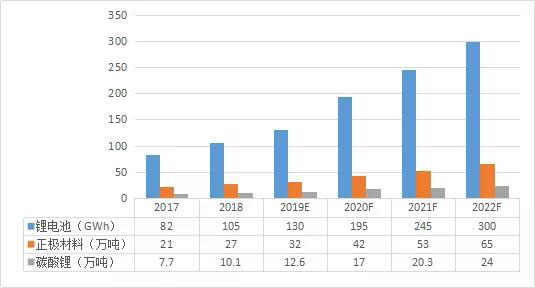 其消耗碳酸鋰量為10.1萬噸(一噸不同類型的正極材料需消耗碳酸鋰量為0.3~0.42噸),同比增長32%。預(yù)計到2022年中國鋰電池產(chǎn)量將達300GWh,消耗碳酸鋰量將達到24萬噸,年復(fù)合增長率超過24%。
