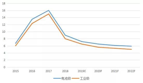 預(yù)計未來隨著各大企業(yè)的擴張和鹵水提鋰技術(shù)的進步,其價格到2022年將跌至5萬元/噸(工業(yè)級),6萬元/噸(電池級)。