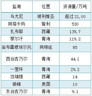 從全球主要鹽湖鹵水鋰含量地區(qū)來看,據(jù)美國地質(zhì)勘探局數(shù)據(jù),目前世界鹽湖鋰含量最高的為玻利維亞烏尤尼,其鋰含量折算稱碳酸鋰量高超過2100萬噸,是目前已知最大的鋰含量鹽湖。