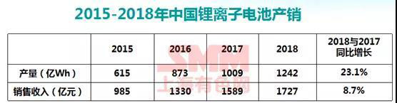 根據(jù)中國(guó)化學(xué)與物理電源行業(yè)協(xié)會(huì)統(tǒng)計(jì)分析,2018年中國(guó)鋰離子電池銷(xiāo)售收入達(dá)到1727億元,比2017年的1589億元,同比增長(zhǎng)8.7%。鋰離子電池的產(chǎn)量由1009億瓦時(shí)增長(zhǎng)到1242億瓦時(shí),同比增長(zhǎng)23.1%。主要是由新能源汽車(chē)動(dòng)力電池和儲(chǔ)能電池市場(chǎng)的快速增長(zhǎng)。