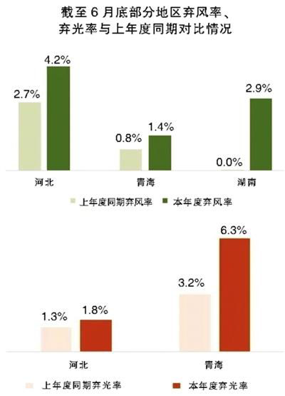 河北、青海、湖南存在新能源棄電加重的潛在風(fēng)險。河北張家口、承德以及青海海西州等局部電網(wǎng)送出受限問題尚未解決,湖南在進入汛期后本地新能源消納壓力持續(xù)增加。截至6月底,河北棄風(fēng)率、棄光率同比分別增長1.5、0.4個百分點,青海棄風(fēng)率、棄光率同比分別增長0.6、3.1個百分點,湖南棄風(fēng)率同比增長2.9個百分點,上述地區(qū)新能源棄電存在進一步增加的風(fēng)險,需要重點關(guān)注。