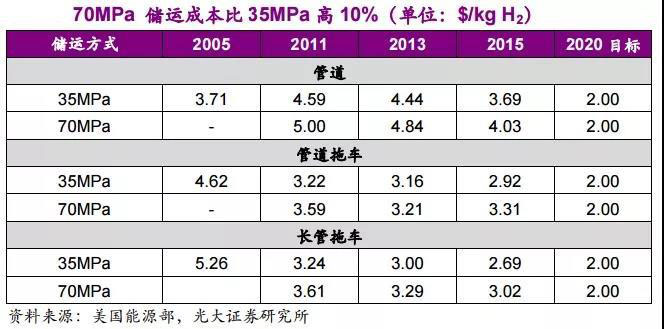 根據(jù)美國能源局(DOE)研究數(shù)據(jù),自2005年以來長管拖車儲(chǔ)運(yùn)成本下降幅度最大,35MPa由2005年的5.26$/kgH2下降到2015年的2.69$/kgH2,但同期與70MPa相比成本高出10%左右。