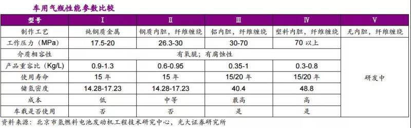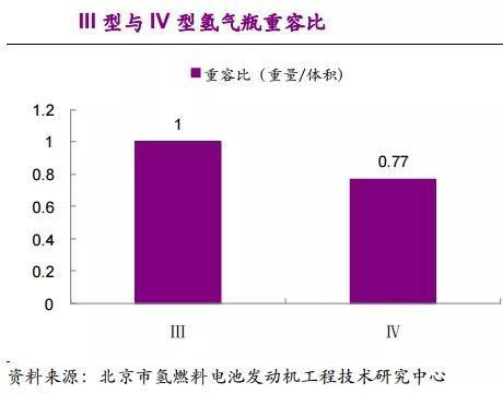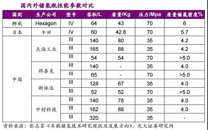 國內(nèi)企業(yè)采用III型(金屬內(nèi)膽纖維全纏繞氣瓶)儲(chǔ)氫密度為3.9%,而IV型(非金屬內(nèi)膽纖維全纏繞氣瓶)的儲(chǔ)氫密度可以達(dá)到5.5%。